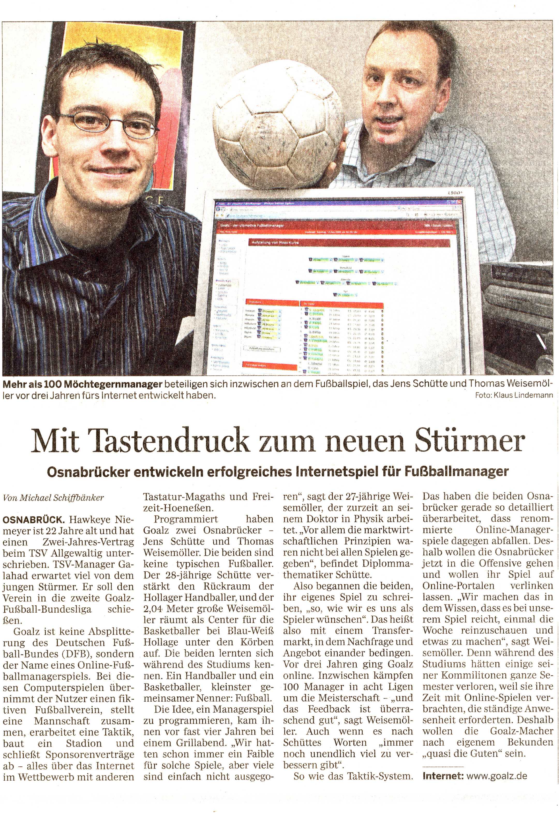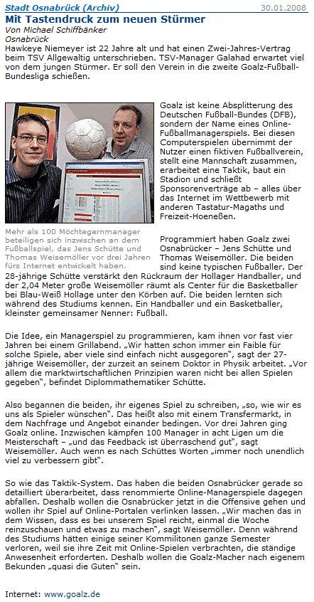 Auch wenn´s schon etwas her ist, aber Thomas und Jens haben es mit ihrem genialen Fußballmanager Goalz.de ebenfalls in die NOZ geschafft. Große Programmierarbeit .. macht weiter so Männer.